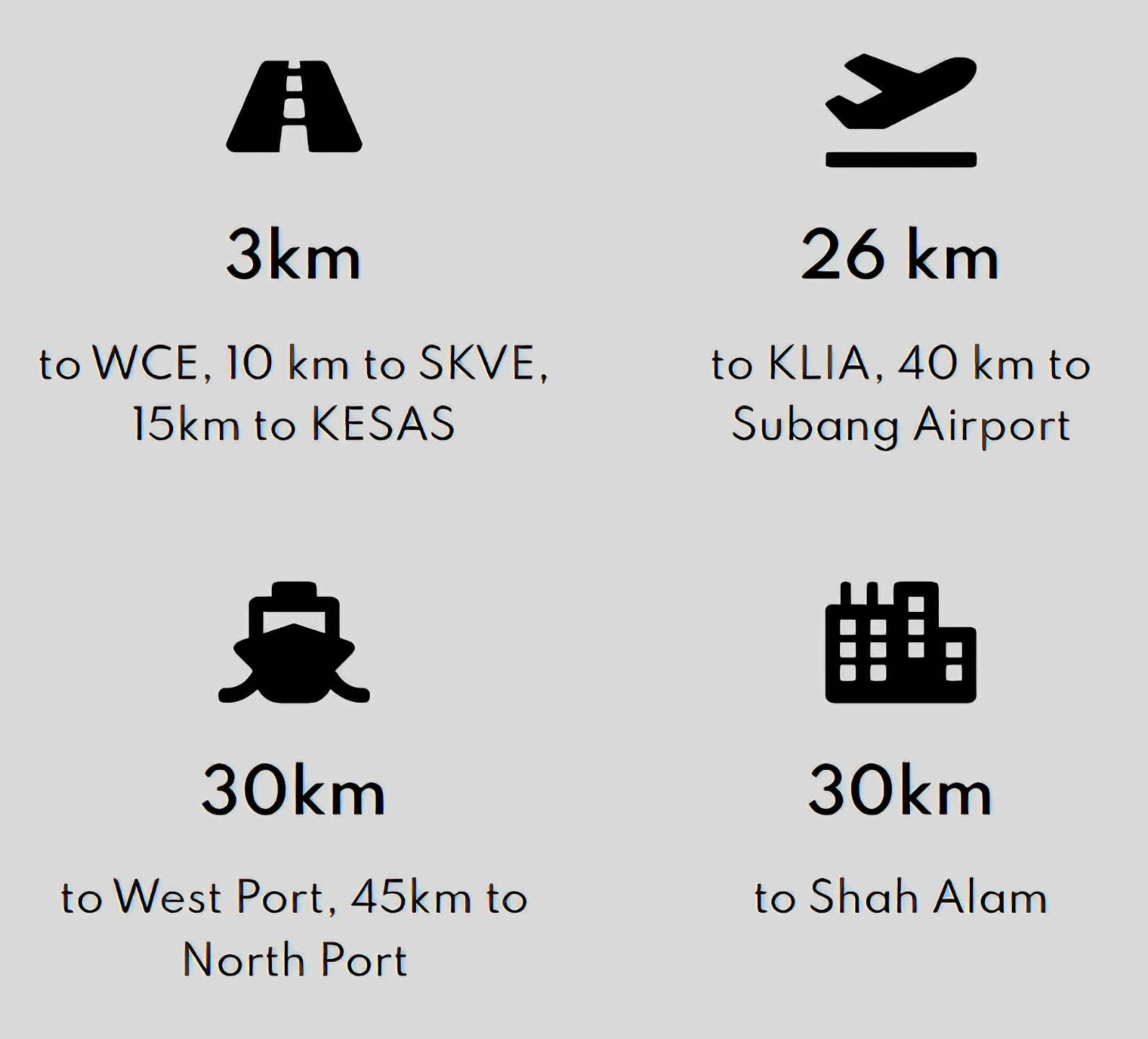 KLIA, Port Klang & Shah Alam within just 30km distance.