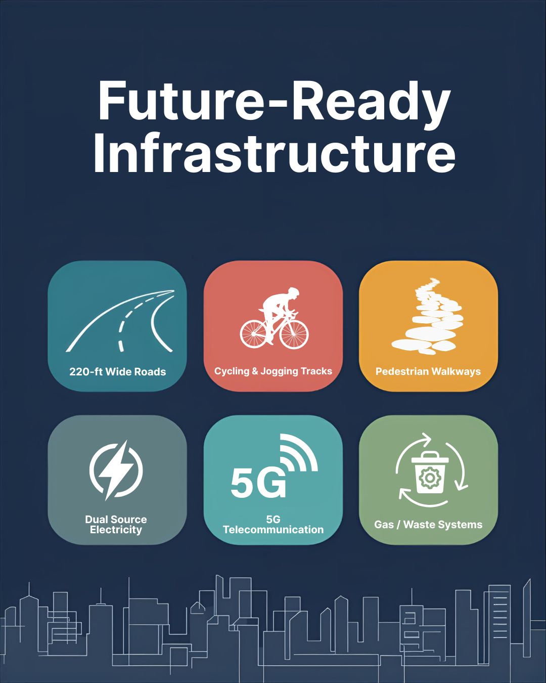 220-foot wide roads, cycling & jogging tracks, pedestrian walkways, dual-source reliable electricity, 5G telecommunications, and gas/waste management systems.